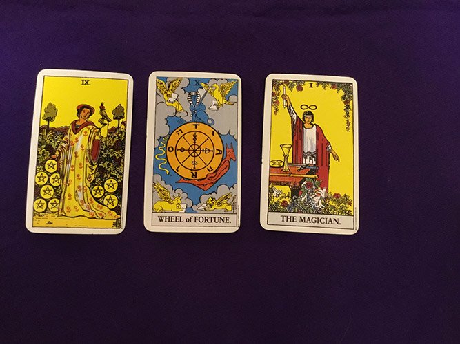 1枚目に魔術師の正位置、サブカードにもう1枚金貨の9の正位置が出てきました。