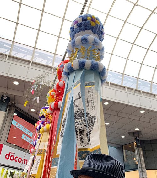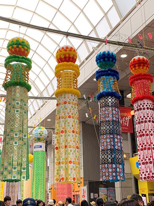 旧暦7月7日なので、8月6日から8日の3日間、アーケード街に10メートルを超える竹に7種類の『7つ飾り』で構成されたくす玉や吹き流しが飾り付けられます。それぞれ意味があるのですよ。